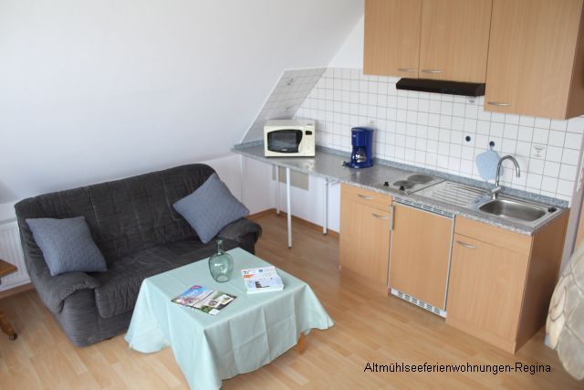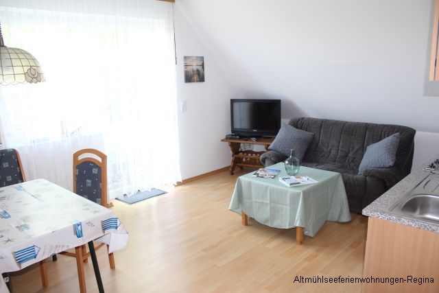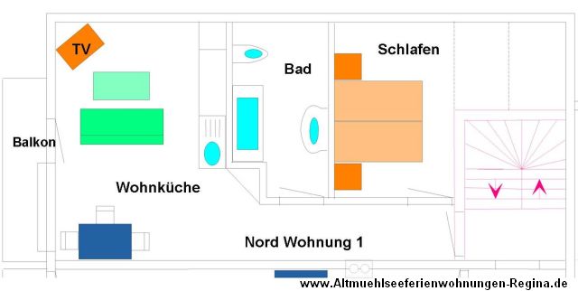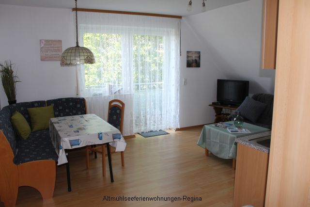 Unsere schöne kühle Wohnung Nord ist im oberen Wohngeschoss und hat eine Grundfläche von ca 55 qm. Sie verfügt über ein Bad, ein Schlafzimmer, Flur und eine Wohnküche mit gemütlicher Küchenzeile. Sie ist ideal für 2 Personen zugeschnitten. Die Wohnung ist im gemütlichen Wohnstil liebevoll eingerichtet. Alle notwendigen Küchenutensilien vom Teller bis zur Kaffeemaschine sind vorhanden. Das Bad verfügt über eine Badewannen/ Duschkombination. Durch die Wohnküche kann ganz bequem der Südwest Balkon mit Tisch und zwei Stühlen erreicht werden. Für den Sonnenschutz ist auf dem Balkon ein Sonnenschirm vorhanden. SAT-TV , WLAN und ein Fahrzeugstellplatz mit Lademöglichkeit für Ihr E-Fahrzeug gehört mit zu dieser Wohnung, genauso wie die verschließbare Unterbringung Ihrer mitgebrachten Fahrräder für die Erkundungsausflüge rund um den Altmühlsee und das Altmühltal.